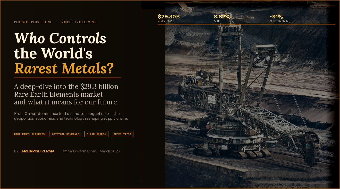 That changed for me when I started working on the research framework for what eventually became Navadhi’s Global Rare Earth Elements Market Strategic Research Report 2026–2031 . The deeper I went, the more I realised that this wasn’t a commodity story at all. It was a geopolitical story. A technology story. A story about who gets to build the future — and on whose terms.